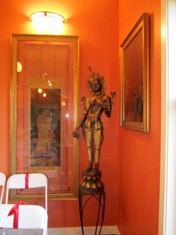 Back of building, blue/gold entrance.. Facing shrine From my seat, Pema will speak from chair.