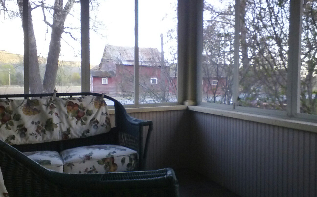 Front porch around the corner my view while eating dinner, a barn across the street.