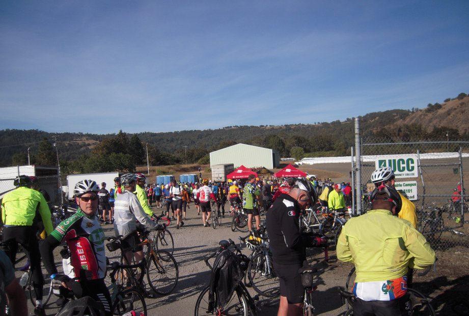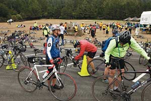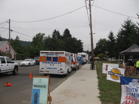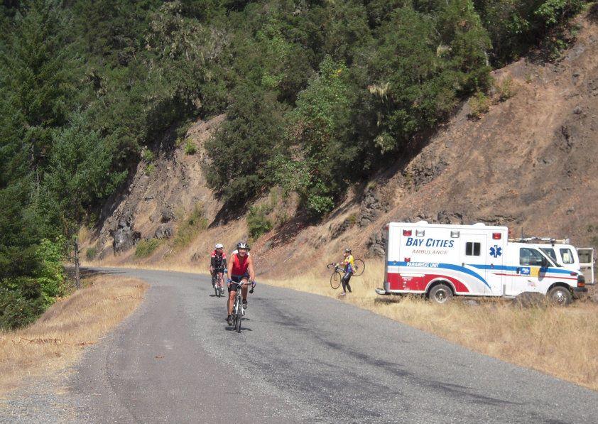 Help is always near by. Some cannot make it to the top of the climb so they hitch a ride with the SAG van (parked behind the ambulance) . SAG stands for "Support and Gear"