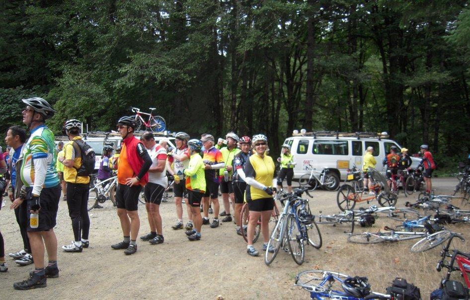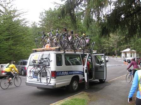 "Sag Van" taking cyclist who did not wish to climb out from the coast. Can't tell you how many loaded Sag vans pass us going into Bandon.